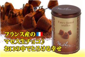 とろけるおいしさ再入荷【クール便発送】★mathez★生トリュフチョコレート2缶1kgとろける♪★マセズ★マセス★マテス【あと4時間0908】価格: 1,950円レビュー評価: 4.29 レビュー数:7 到着後は冷蔵庫に入れてくださいねフランス産のおいしい生チョコ♪マセズ★マセス★マテス★mathez★訳され方はいろいろですがその味のおいしさは変わりません♪ゴールド缶2個セットバレンタインデーの時にはなんと4粒高級そうに並んで350円でバレンタインコーナーに並んでいました。この大容量を知っている私は思わず笑ってしまいましたが。。。おいし????い♪お土産にいただいた方も 未体験の方もとにかく食べてみてください!!本当においしい!濃厚な生トリュフチョコレートをご堪能ください。プレーン生トリュフチョコ(250g入り2袋)500gが2缶の箱入りセットです。今回のロットはゴージャスゴールド缶 2巻 プ |